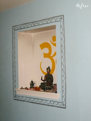 When thinking through a design - we really wanted to bring in some Indian inspired details to balance some of the more modern touches we added. So we planned out hand painted detailing around all 7 wall sconces in the room, and the altar on the opposite wall.